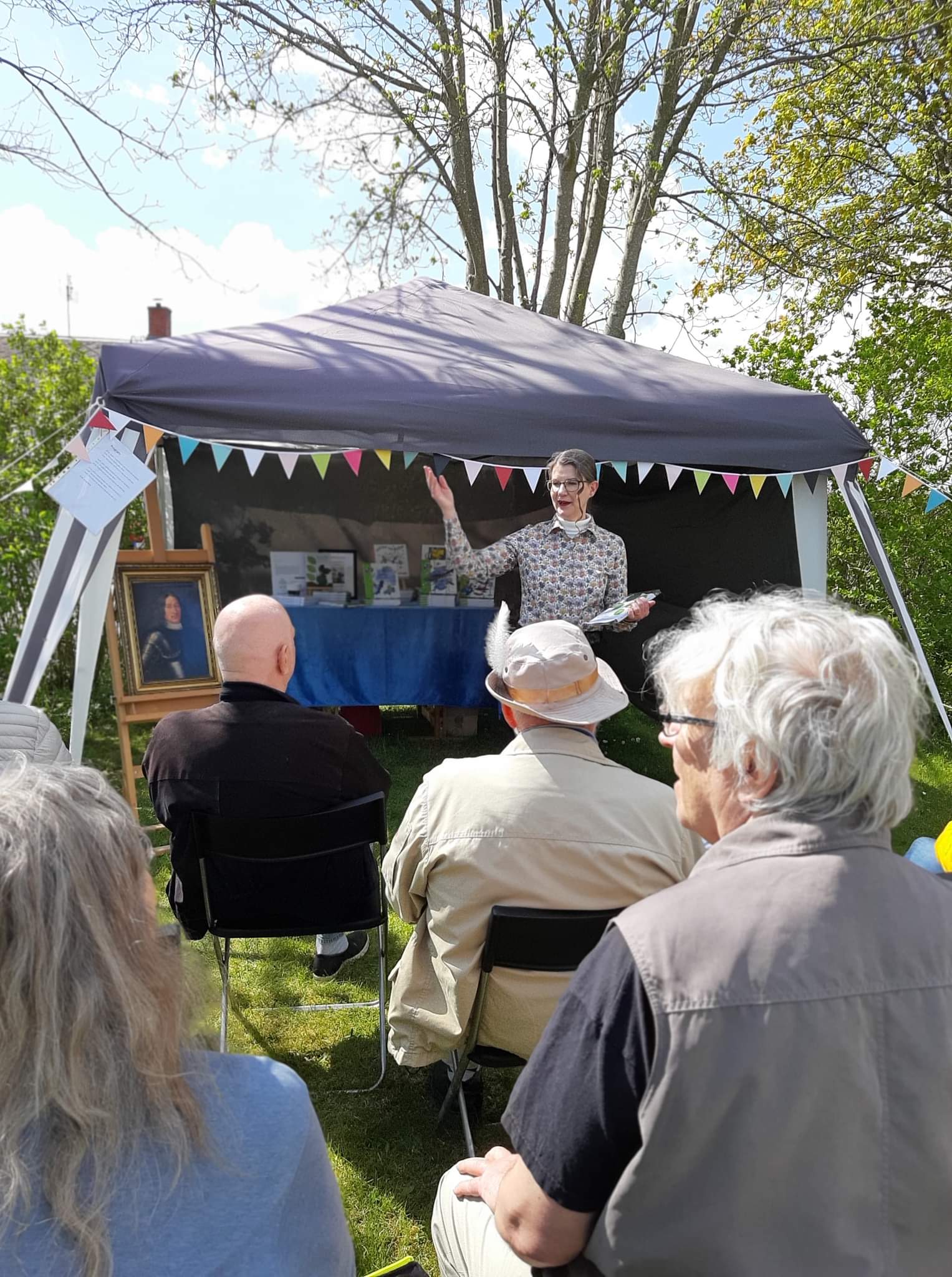 Nu har jag turen att bo granne med ett författar- och konstnärspar så i år gick vi samman och arrangerade ett evenemang i deras trädgård. Vi satte upp ett litteraturtält som inreddes med ett bokbord där vi dukade fram sagor, historia och poesi. Tältet dekorerades med färgglada vimplar och trädgården fylldes med skulpturer och målningar. Programmet innehöll tre uppläsningar där vi bjöd på smakprov av våra helt olika författarskap. Jag läste mestadels haikudikter men även annan typ av poesi, Joakim berättade om och läste ur sina sagoböcker och Stina tog oss med på en tidsresa till 1600-talet där hennes kommande roman utspelas. Vi bjöd på fika och sedan avslutade vi kvällen i med att grilla och prata litteratur.